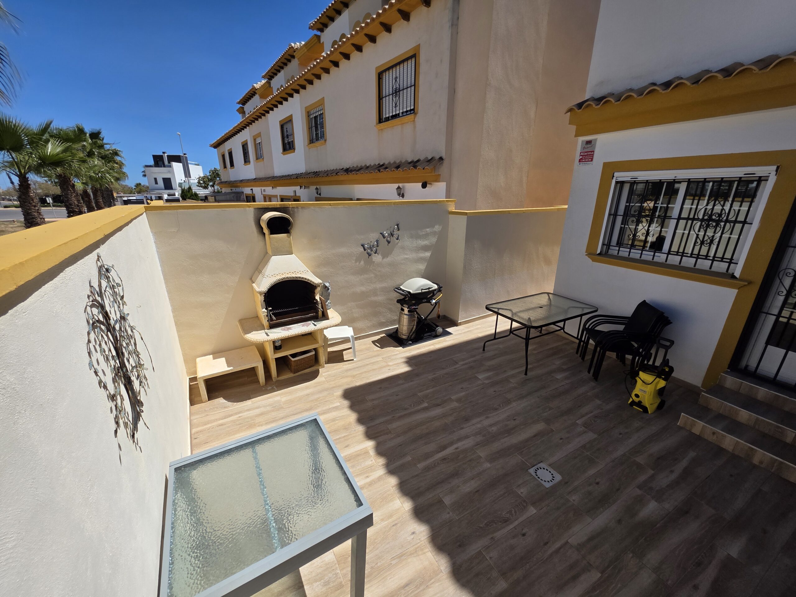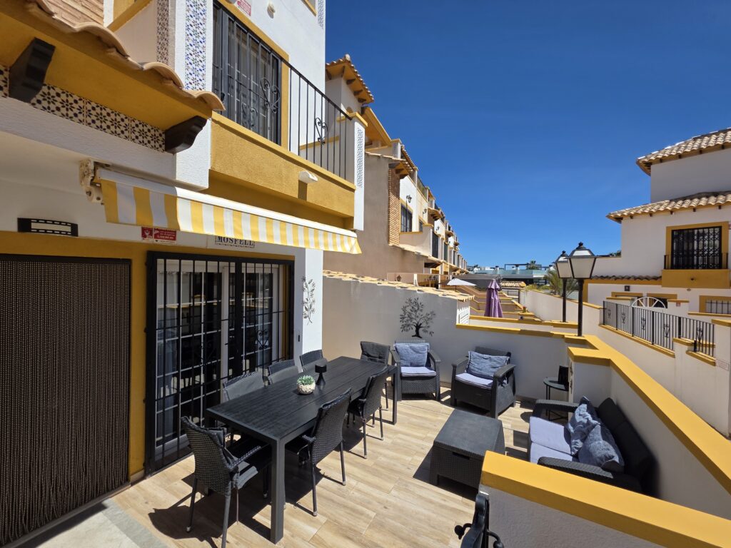Um er að ræða endaraðhús með gistirými fyrir 6-8 manns. Húsnæðið er 118 fermetrar á þremur hæðum á 1. hæð er herbergi með góðu rúmi (140cm) , sameiginleg stofa , eldhús og wc. Á 2.hæð eru tvö herbergi annað með hjónarúmi og hitt með 2. rúmum sem hægt er að færa saman, wc/baðherbergi og lítið hol , á þriðju hæð er svo herbergi með hjónarúmi og baðherbergi, útgengt er á sólarsvalir með góðu útsýni yfir svæðið, sést yfir á La Manga skagann. Innbyggð loftkæling og kynding er í húsinu með auðveldu stýrikerfi og er það nánast hljóðlaust. Í stofu er sjónvarp með fjölda sjónvarpsrása. Stækkanlegt borðstofuborð með 6 stólum er í borðstofu. Í eldhúsi er ísskápur , uppþvottavél, þvottavél, kaffivél, air fryer, brauðrist, safapressa, blandari, pottar , pönnur og öll helstu áhöld til matargerðar, allur borðbúnaður er fyrir 10 manns. Svefnherbergin eru með góðum rúmum, barnaferðarúm og barnastóll er til staðar. Stórir skápar eru í herbergjum á annari hæð. Baðherbergin eru þrjú, á fyrstu hæðinni er klósett, vaskur en á annarri hæðinni er sturta, klósett, vaskur og góðir skápar, á þriðju hæðinni er sturta vaskur og skápur. Öll rúmföt og handklæði eru til staðar, ásamt strandhandklæðum. Lóð húsins er afgirt og hægt er ganga með húsinu í bakgarð ,einnig er útgangur úr eldhúsi í bakgarðinn. Sólbaðsaðstaða og gott rými er til að borða úti bæði á verönd og í bakgarði. Sundlaugargarðurinn er í lokuðum kjarna á milli húsanna og er garðurinn læstur fyrir almenningi , einungis ætlaður þeim sem gista húsin og gestum þeirra. Húsið er vel staðsett, þú horfir út til sundlaugarinnar frá verönd og sérð til beggja innganga inn í garðinn. Húsinu fylgir stórt útigrill, gas grill og útihúsgögn fyrir 8 til 10 manns og sólbekkir fyrir 4.